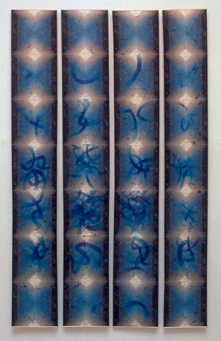 This piece explores the spatial qualities of colour of different media. Blue dye interacts with blue digital print. and always dominates. The digital image is repeated in each square section, but each collage over which it is printed is unique, as are the batiks embedded within in each collage. |